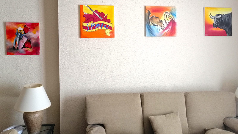 The teachers used the exercise over a period of a year to teach a little more about Spain and the culture as well as to hone their painting skills. In that year they produced over 150 paintings that we purchased and now appear in some of our apartments at Pueblo Evita.